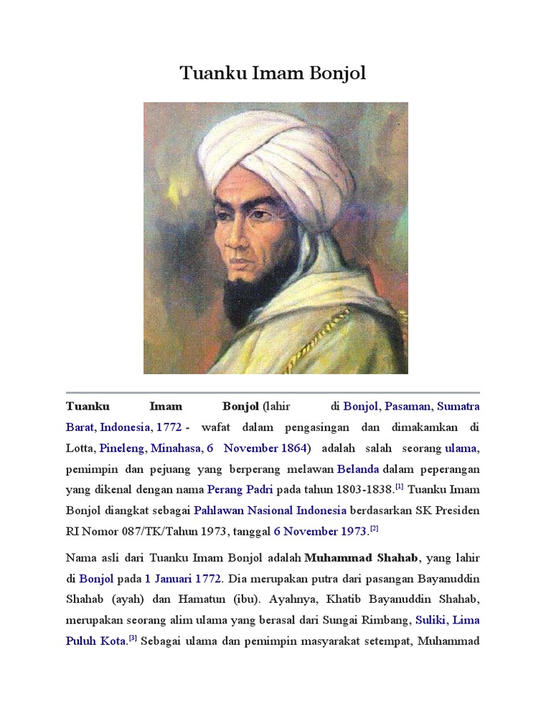 Tuanku Imam Bonjol 1722-1864 kang diangkat dadi pahlawan nasional didasrke SK Présidhèn RI Nomor 087TKTahun 1973 6 November 1973 yaiku pemimpin utama Perang. Muhammad prophet is a last prophet for muslim religion. Tuanku Imam Bonjol lahir di Bonjol Luhak Agam Pagaruyung 1772 wafat dalam pengasingan dan dimakamkan di Lotta Pineleng Minahasa 6 November 1864 adalah salah.