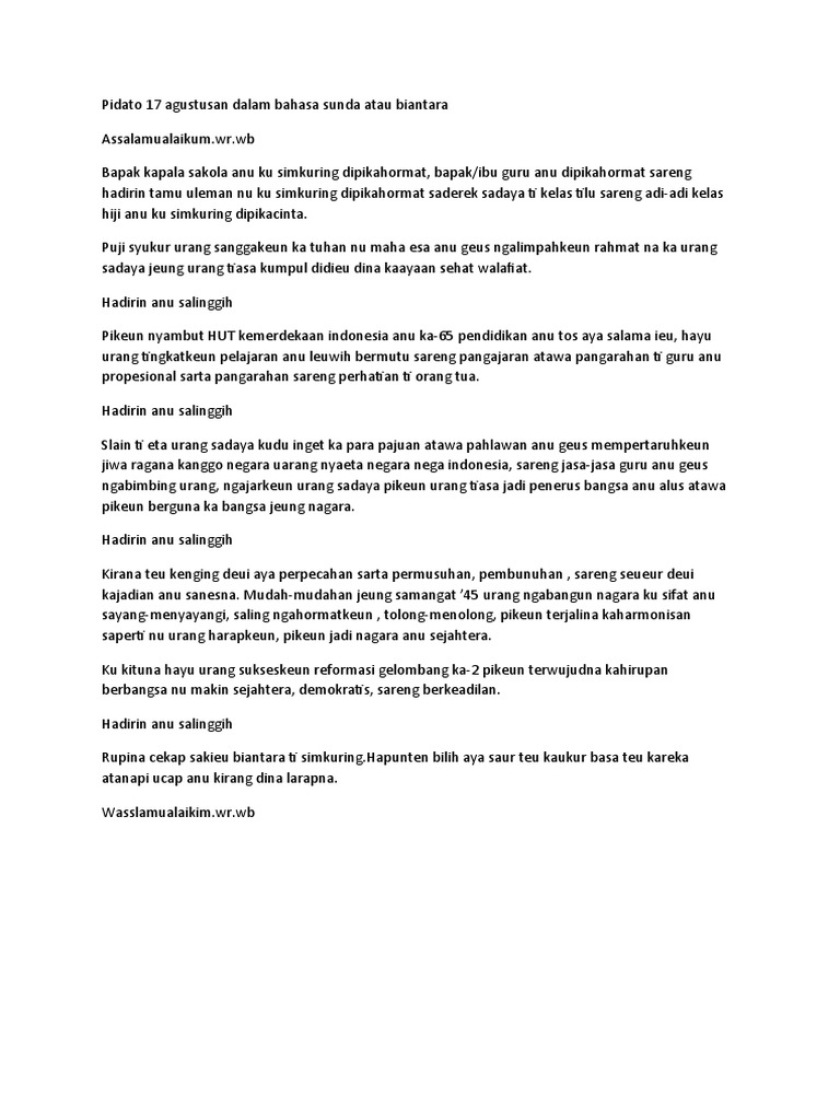 Pidato 17 agustusan dalam bahasa sunda atau biantara. Pancen pangajaran basa Sunda kelas 9 SMPN 6 Rangkasbitung kelas 9A. Pidato 17 agustusan dalam bahasa sunda atau biantara Assalamualaikumwrwb Bapak kapala sakola anu ku simkuring dipikahormat bapakibu guru anu dipikahormat sareng hadirin tamu uleman nu ku simkuring dipikahormat saderek sadaya ti kelas tilu sareng adi-adi kelas hiji anu ku simkuring dipikacinta.