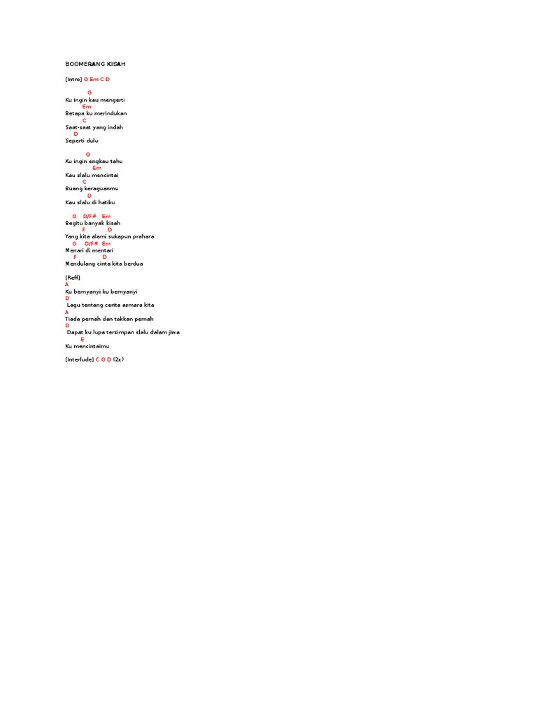 Boomerang - Kisah Chord Gitar dan Lirik Lagu 6 hari yang lalu 3 views - - Boomerang - Kisah Chord. G ku ingin engkau tahu Em ku selalu mencintaimu C buang keraguanmu D kau selalu di hatiku. E C G D.