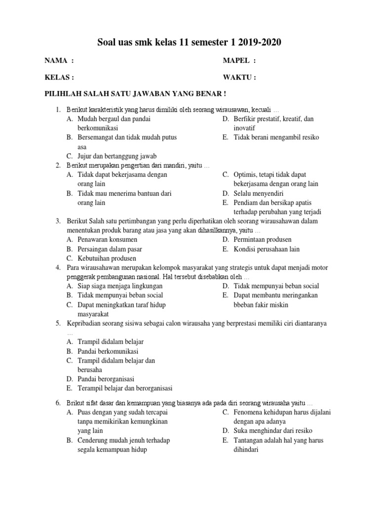 Soal Uas Smk X1 Semester 1 2019 Pdf