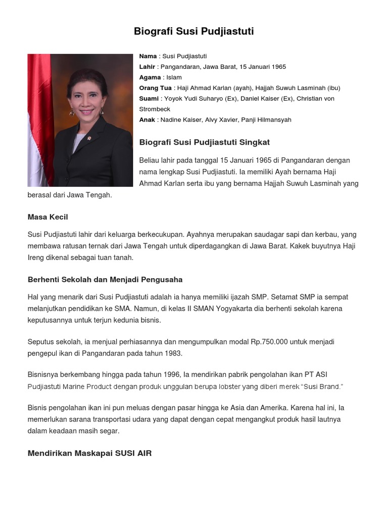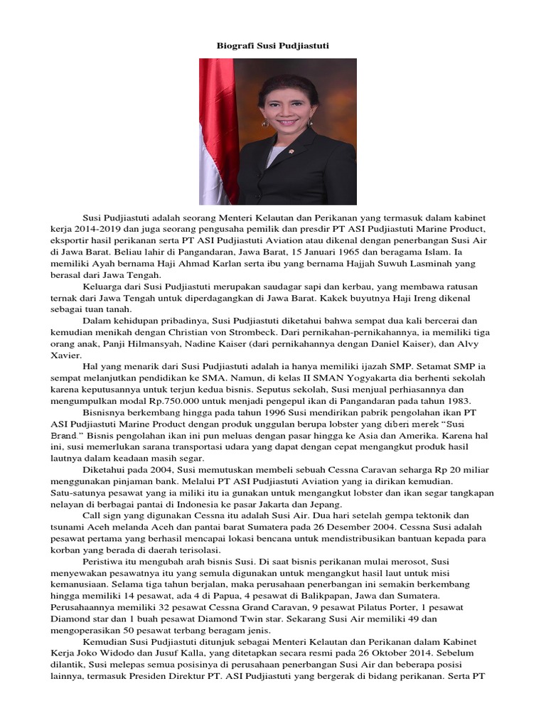 Biografi susi pudjiastuti dalam bahasa inggris. Biografi Susi Pudjiastuti Singkat. Biografi Lengkap Susi Pudjiastuti Susi Pudjiastuti adalah seorang Menteri Kelautan dan Perikanan yang termasuk dalam Kabinet Kerja 2014-2019 dan juga seorang. Artikel kali ini akan membahas mengenai Profil dan Biografi dari Susi Pudjiastuti.